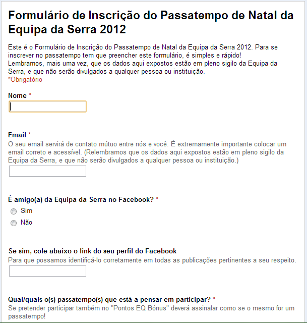 Então, devido a isso, os membros oficiais da Equipa da Serra optaram por publicar, neste ano, o Passatempo de Natal de 2012. Este ano, após 2 dias da publicação do Passatempo, «ainda não houve nenhuma inscrição», lamenta um dos membros oficiais desta Equipa.